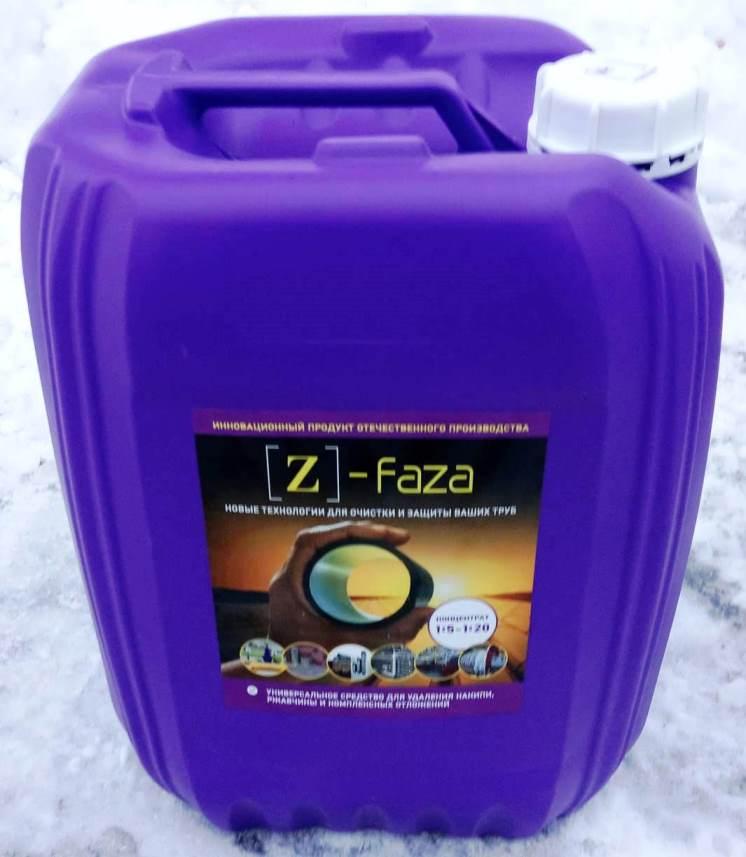 Z-faza для очистки от отложений с внутренних поверхностей котлов, систем отопления, систем водоснабжения, бойлеров, водонагревателей, конденсаторов, чиллеров, трубопроводов, водопроводов и другого теплотехнического, теплообменного и котельного оборудования, выполненного из чёрных металлов и сплавов. В Томске разработан специальный реагент для очистки труб «Z-faza». Если на Вашем предприятии в трубопроводах, выполненных из чёрной стали, появляются отложения на стенках, то с течением времени внутри труб появляются соли, песок и другие отходы. В результате происходит снижение диаметра труб, что существенно снижает их эффективность. Поэтому срок службы таких труб невелик, около 25 лет. В связи с этим были утверждены правила промывки теплообменного оборудования на производстве (раз в 3–4 года обязательно).