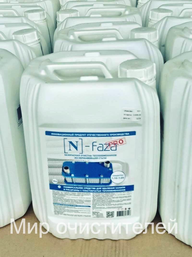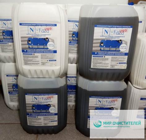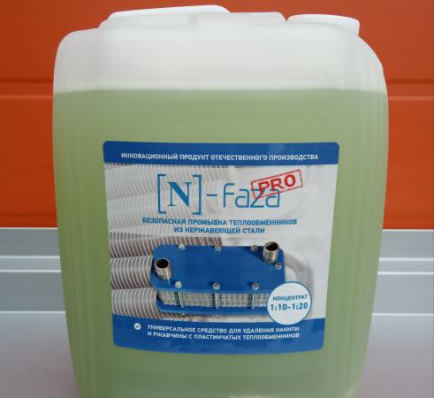 N-Faza – средство для безразборной промывки и удаления накипи, ржавчины, солей карбонатной природы, оксидов с пластинчатых теплообменников, выполненных из нержавеющей стали. Также средство применяют при очистке котлов, бойлеров, конденсаторов и теплообменного оборудования из цветных металлов на предприятиях энергетики, теплоснабжения, коммунального хозяйства, водоснабжения, котельных, в системах отопления и водоснабжения подвижного состава.