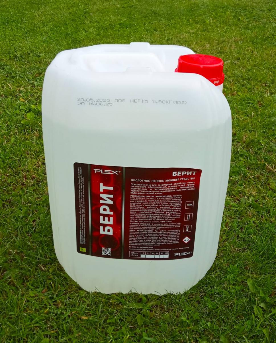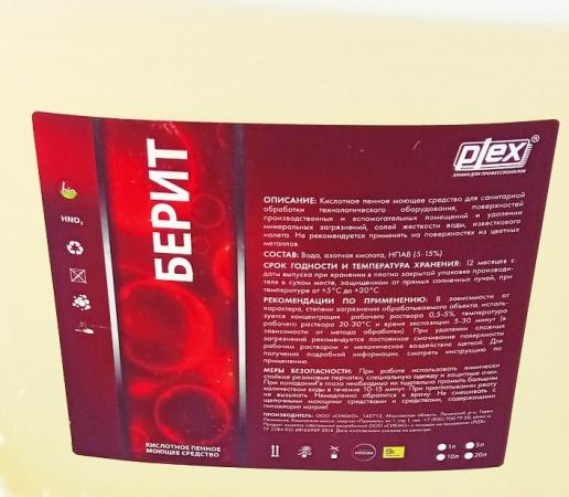 Состав БЕРИТ: азотная кислота, ПАВ, ингибиторы коррозии, вода дистиллированная.Кислотное пенное средство БЕРИТ для мойки минеральных отложений, пивного, водного, молочного камня.Без запахаБесцветный
